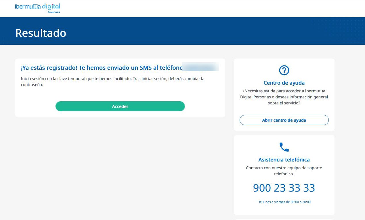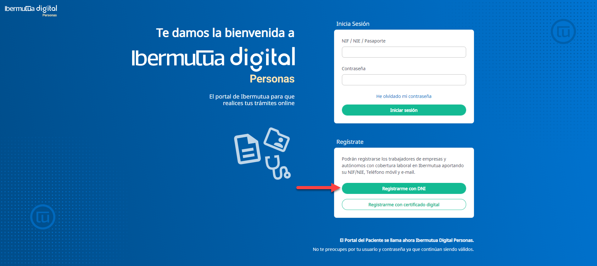 En la página de inicio de Ibermutua Digital Personas > selecciona la opción "Registrarme con DNI".