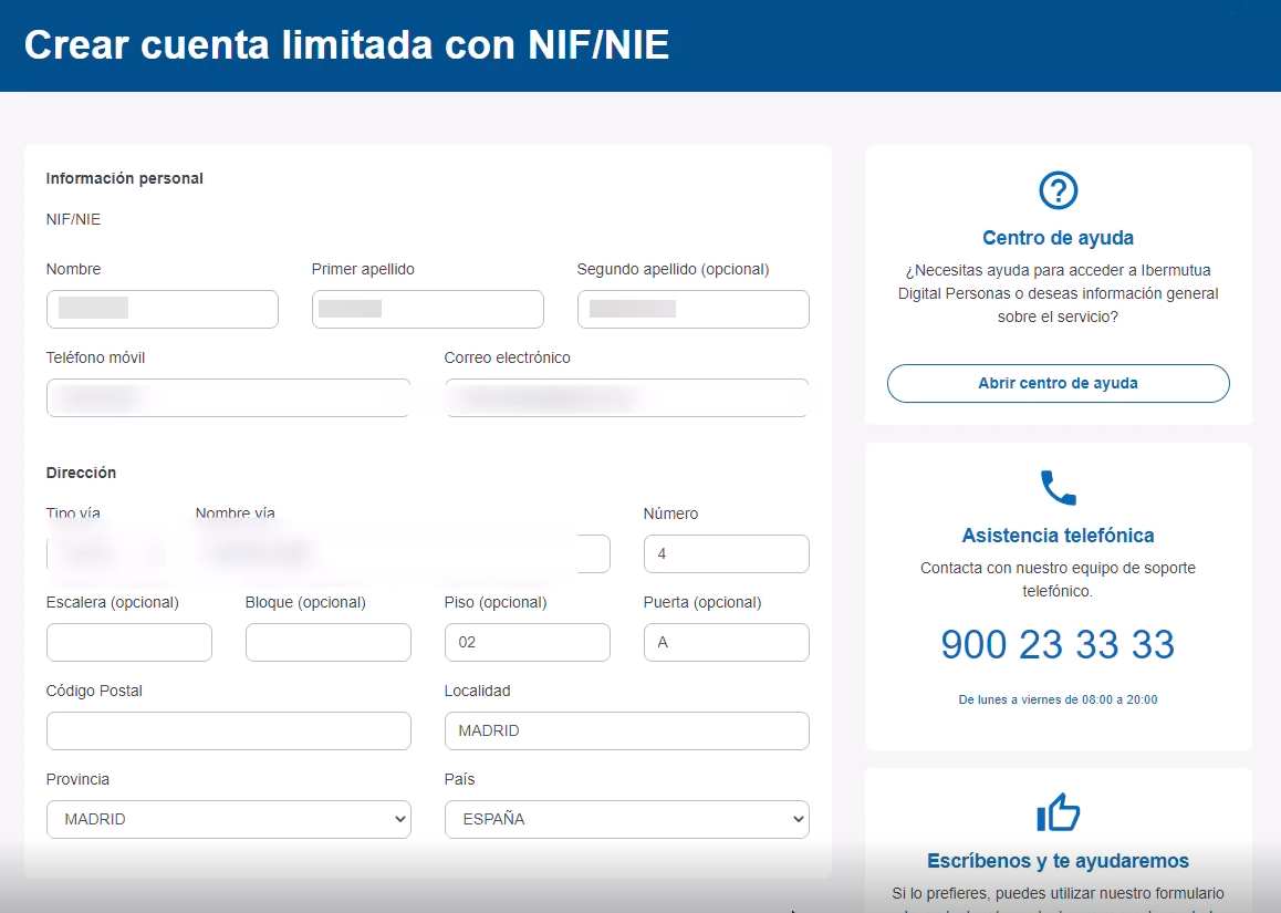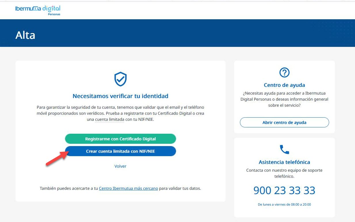 Para aquellos casos en los que no sea posible la verificación online de la identidad por alguno de los procedimientos mencionados para el alta completa, existe la posibilidad de solicitar un alta limitada. Esta solo da acceso a la posibilidad de solicitar y hacer seguimiento de las prestaciones económicas a las que se tenga derecho (en este momento, limitado a la solicitud de la prestación por riesgo de embarazo y lactancia), quedando deshabilitado el acceso al resto de funcionalidades de Ibermutua Digital Personas que requieren una verificación completa de la identidad de la persona (datos de salud, económicos,...). A continuación, se explica el procedimiento de alta limitada en Ibermutua Digital Personas:
