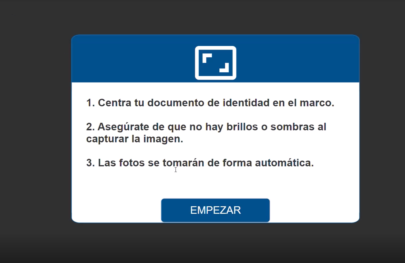 Para la verificación de la identidad se utiliza un sistema de identificación biométrica que garantiza que la documentación aportada no está falsificada y que la titularidad de dicha documentación se corresponde con la persona que se identifica en la cámara. A continuación, se explican los pasos: