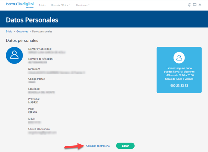 Una vez dentro de Datos Personales, deberás pinchar en la opción de "Cambiar contraseña" en la parte inferior de la página.