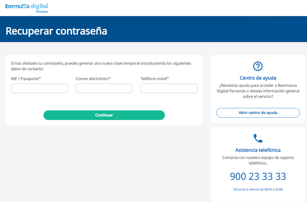 Si en el momento de volver a acceder a Ibermutua Digital has olvidado tu contraseña, podrás generar una nueva de forma fácil. En la página de entrada deberás pinchar en la opción "He olvidado mi contraseña".