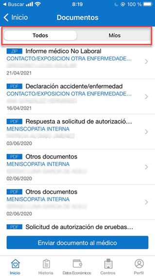 La información enviada por uno mismo aparecerá identificada con la etiqueta ![]() | La información se separa en dos pestañas, una para toda la documentación y otra ("Míos") exclusivamente con la información incorporada por uno mismo. ![]() |