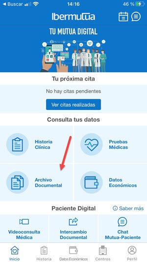 Se accede desde el menú superior Historia Clínica > Documentos o bien desde la opción de Acciones > Descarga tus documentos ![]() | Se accede desde la portada > en la opción de "Archivo Documental" ![]() |