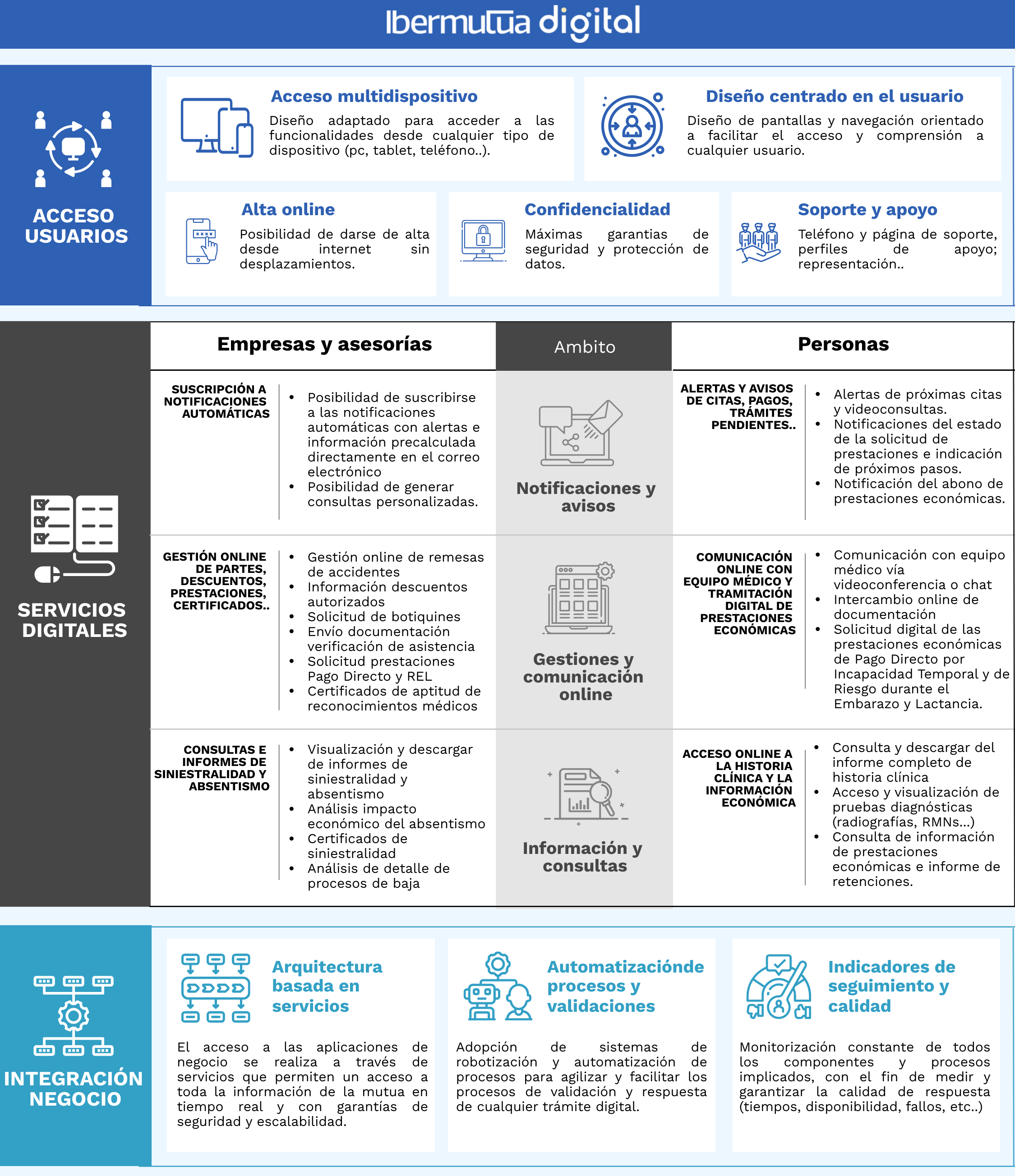 Ibermutua Digital es una apuesta de Ibermutua por ofrecer a nuestros usuarios, ya sean trabajadores (Ibermutua Digital Personas), empresas protegidas (Ibermutua Digital Empresas) o asesorías colaboradoras (Ibermutua Digital Asesorías), un canal digital para facilitar y agilizar el acceso a toda la información, gestiones y comunicaciones que necesiten realizar con la mutua. A continuación, se muestra el esquema general que se ha seguido en el diseño de Ibermutua Digital, con detalle de cada uno de los principales elementos vertebradores.