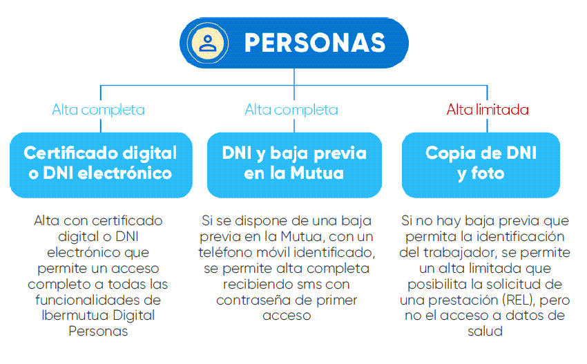 - ALTA COMPLETA: Implica la posibilidad de acceder a TODAS las funcionalidades disponibles en Ibermutua Digital Personas, tanto las que suponen un acceso a datos de salud, como el resto de funcionalidades asociadas a la gestión económica de prestaciones. Hay dos formas de realizar este alta que, por su acceso a datos personales de salud, requiere de una verificación de la identidad: