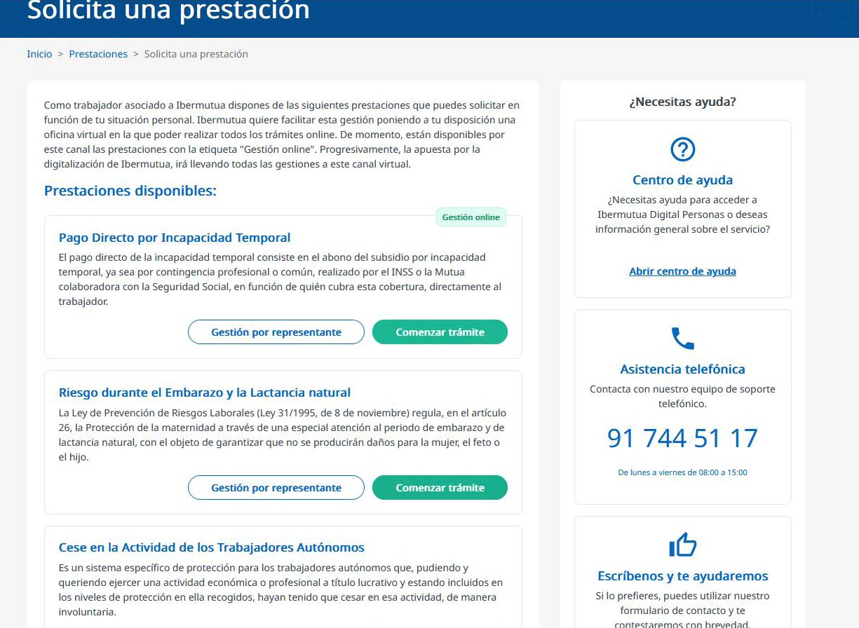 Las siguientes prestaciones están disponibles para su gestión online desde la Oficina Virtual de Ibermutua Digital: