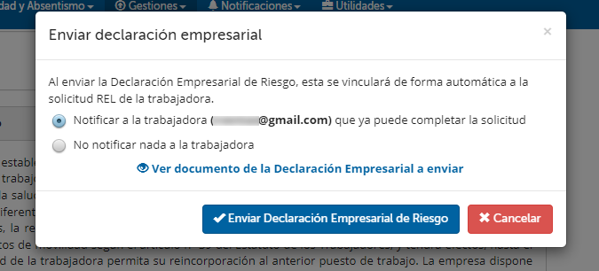 El primer paso será cumplimentar la Declaración empresarial de riesgo de la trabajadora.