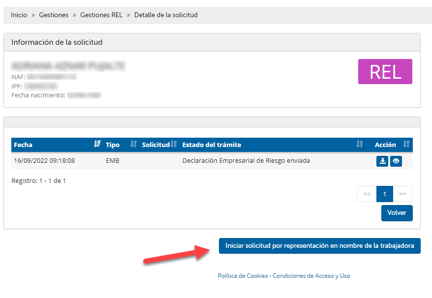 Para continuar con toda la tramitación del REL en nombre de la trabajadora, se deberá "Iniciar solicitud por representación en nombre de la trabajadora".