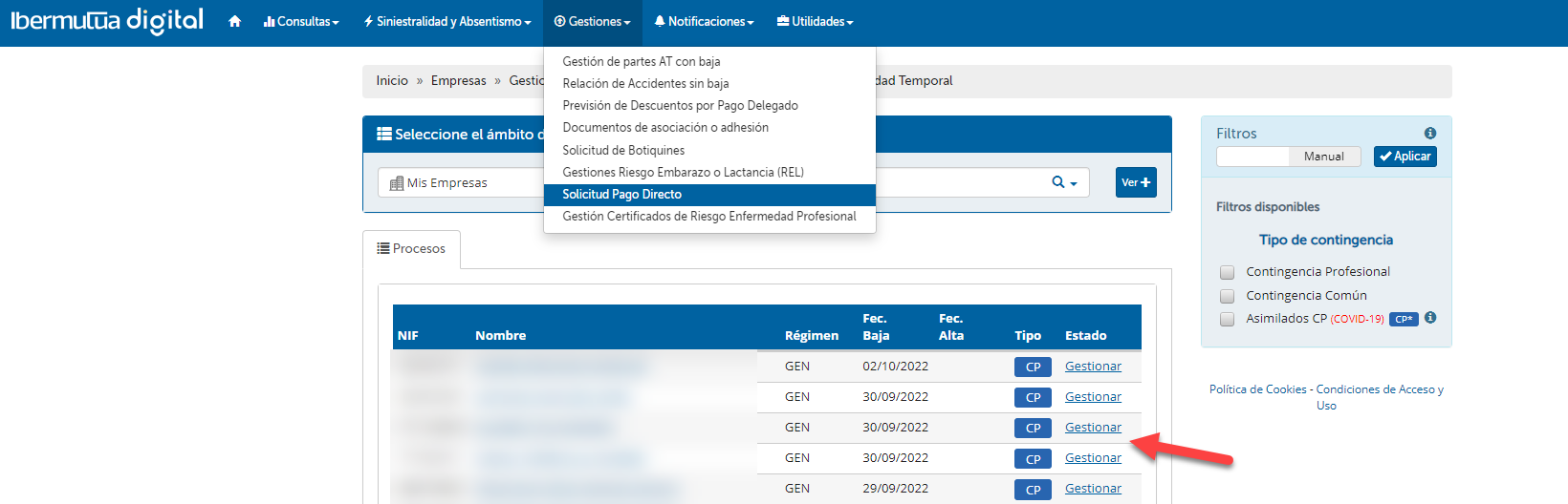 Una vez en la pantalla, aparecerá un listado con todos los procesos en baja y con una opción añadida de "Gestionar", desde la cual se puede iniciar el proceso de solicitud del Pago Directo.