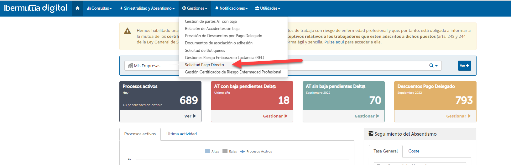 Desde el menú superior acceder a al opción "Gestiones>Solicitud Pago Directo"