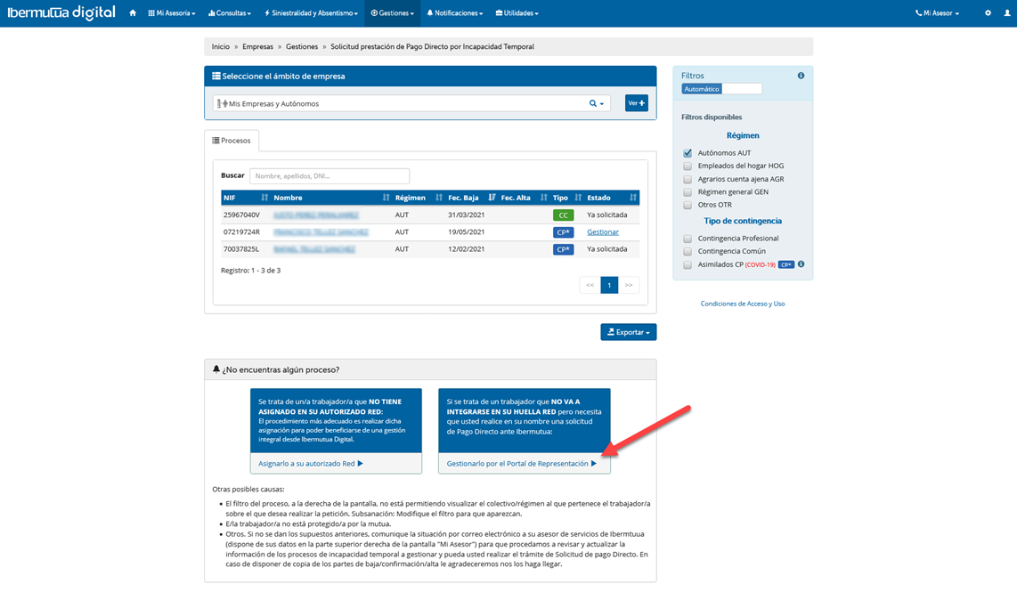 En el caso de que un/a trabajador/a no aparezca en el listado de trabajadores con derecho a solicitar la prestación, está disponible la opción de realizar, para ese caso concreto, la gestión del trámite desde el portal de representación.