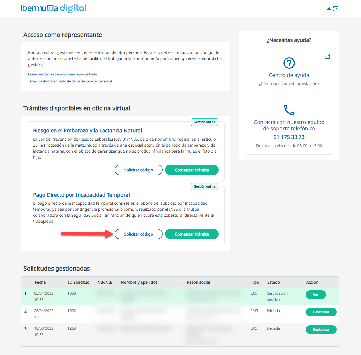 Una vez dentro del portal de Ibermutua Digital Representantes, se deberá hacer click en la opción "Solicitar Código" de la prestación que se quiere solicitar (en este caso, el Pago Directo).