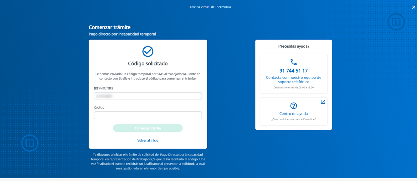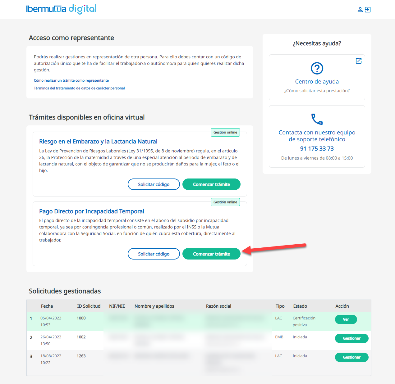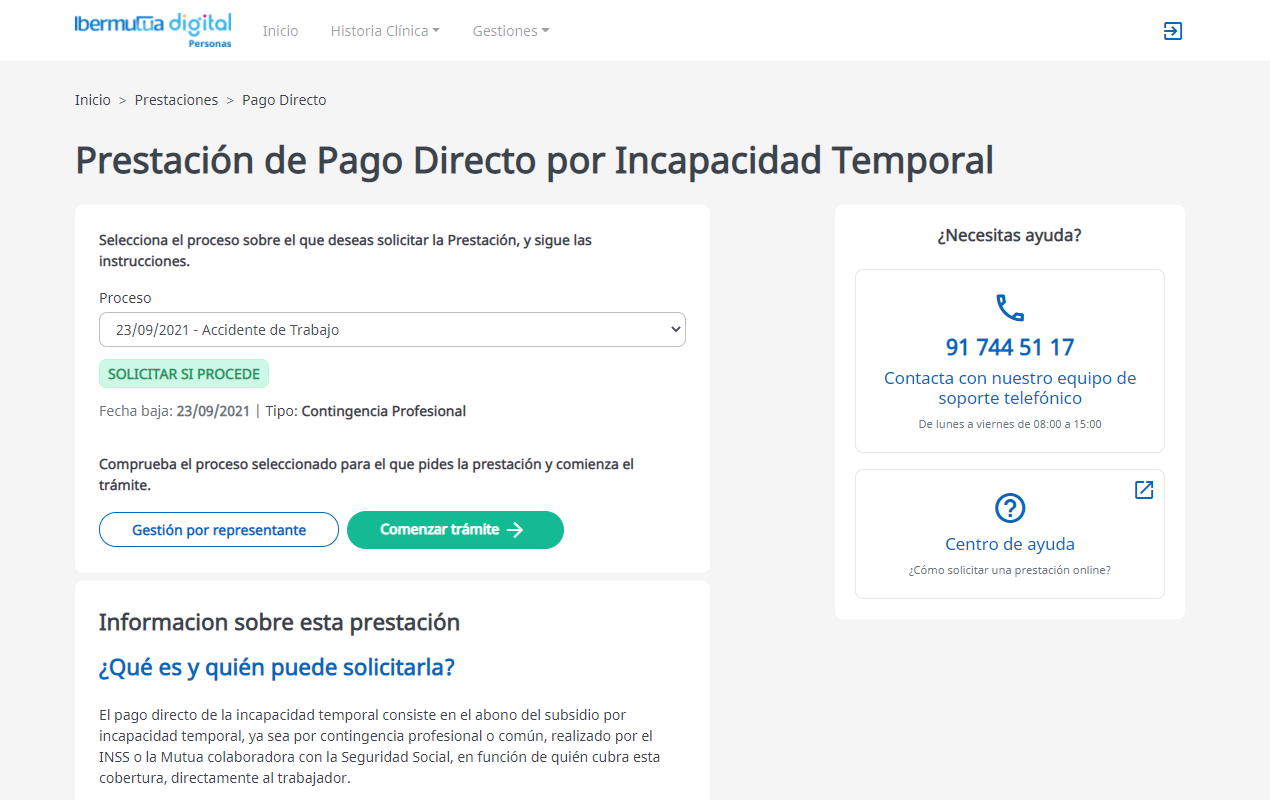 A partir de ahí, el trámite de los pasos y formularios necesarios para la solicitud de la prestación se hará accediendo a la Oficina Virtual de Ibermutua Digital, donde se seguirán exactamente las mismas pantallas y requerimientos que los que tendría que seguir el trabajador/a para la tramitación de la prestación de Pago Directo por IT.