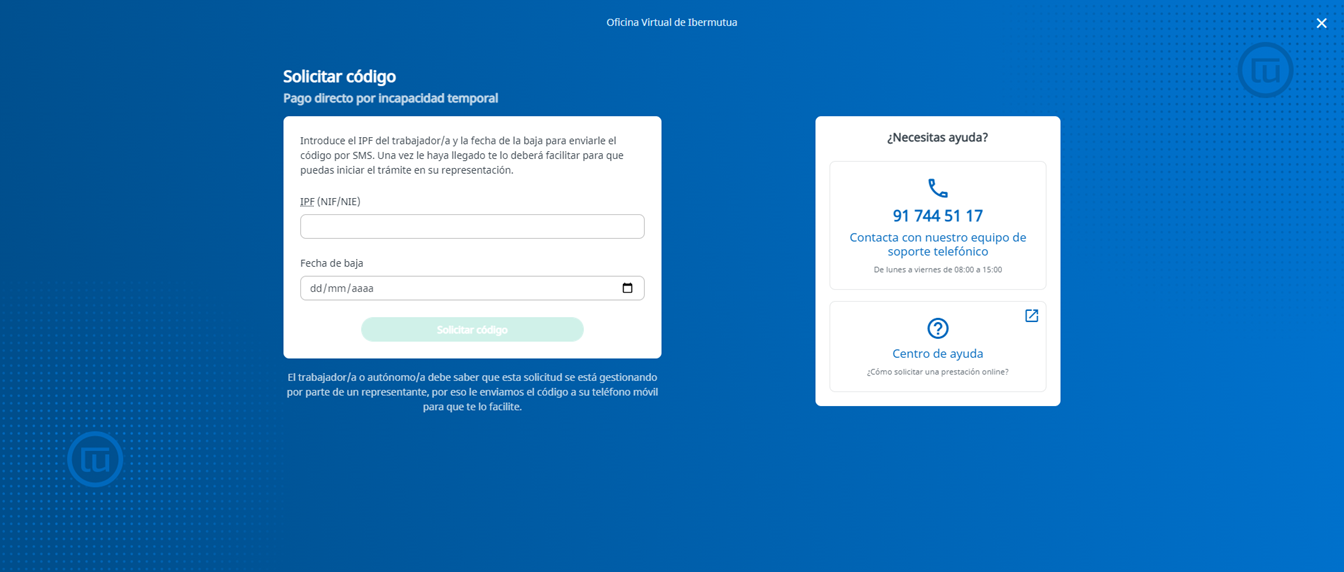 Para la prestación de Pago Directo, se solicita 1) el dato de identificación del trabajador/a para que el que se va a realizar la solicitud (NIF/NIE) y 2) la fecha de baja del proceso para el que se va a generar el código de autorización. El código de autorización se enviará por SMS al trabajador/a, al teléfono que conste registrado en los registros de Ibermutua.