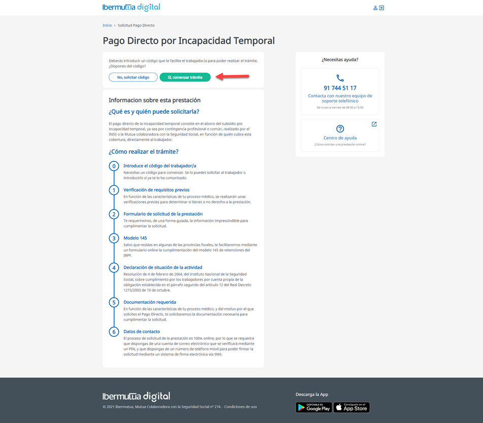 Seguidamente, te llevará a una página inicial de la prestación que se va a solicitar con la información de todos los pasos y requerimientos del proceso. Desde ahí, si ya dispones del código de autorización del trabajador, se deberá hacer click en la opción "Sí, comenzar trámite".