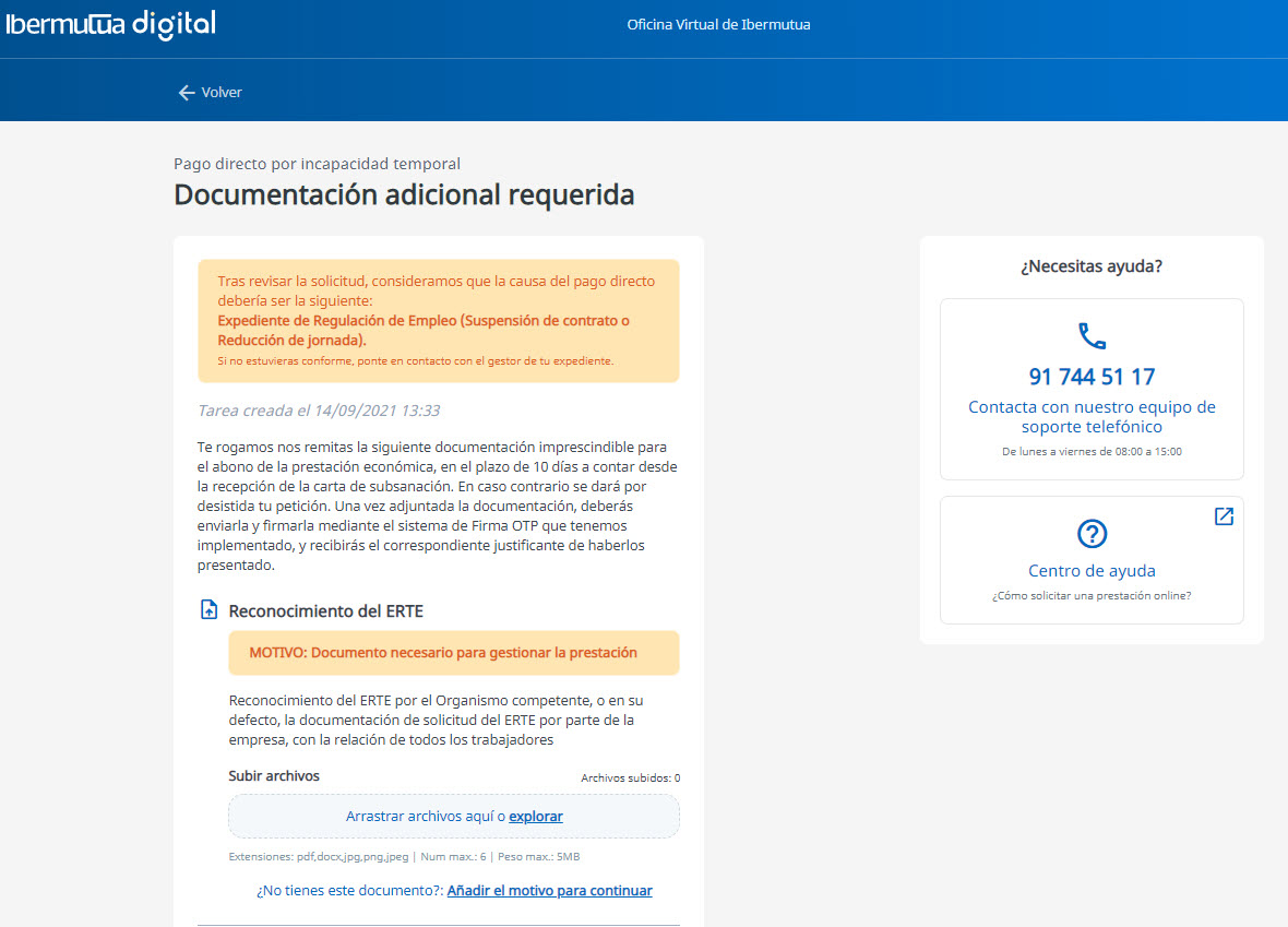 Desde la versión V1.4, se incluye también la posibilidad de realizar de manera 100% online todo el proceso de subsanación de la documentación que desde la mutua se haya reclamado. En algunas ocasiones, en el proceso de evaluación por parte de Ibermutua de la solicitud del pago directo recibida, se considera que hay determinada documentación que o bien no se ha incorporado o está incompleta o no cumple los requisitos formales requeridos. En esos casos, desde la mutua se inicia un proceso de reclamación para que se puedan subsanar esas deficiencias y se pueda continuar con el proceso de evaluación de la solicitud de Pago Directo. A continuación, se explican los pasos para poder realizar la subsanación de manera cómoda desde Ibermutua Digital Personas.