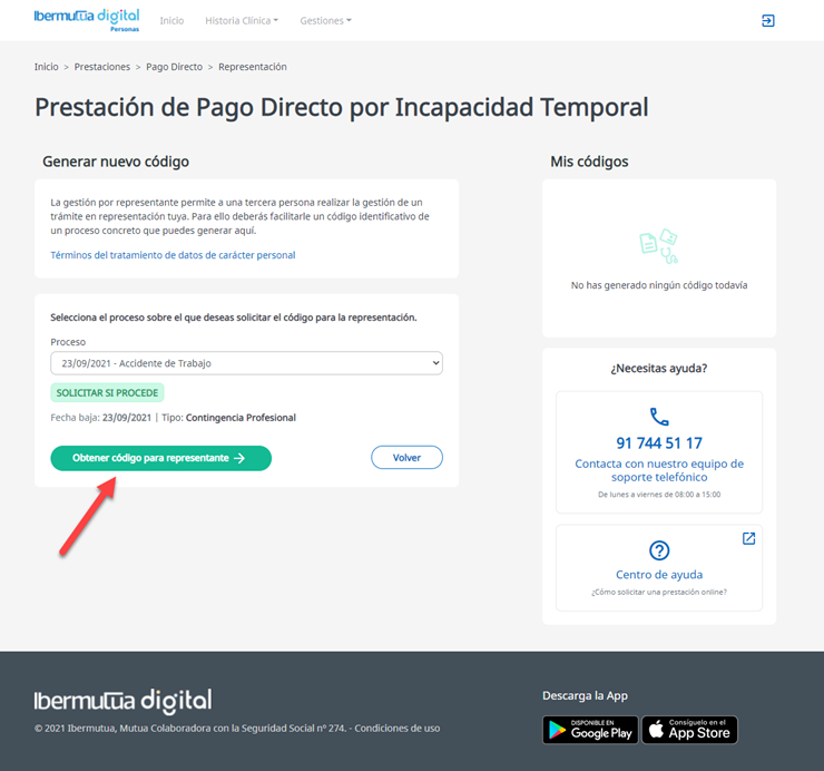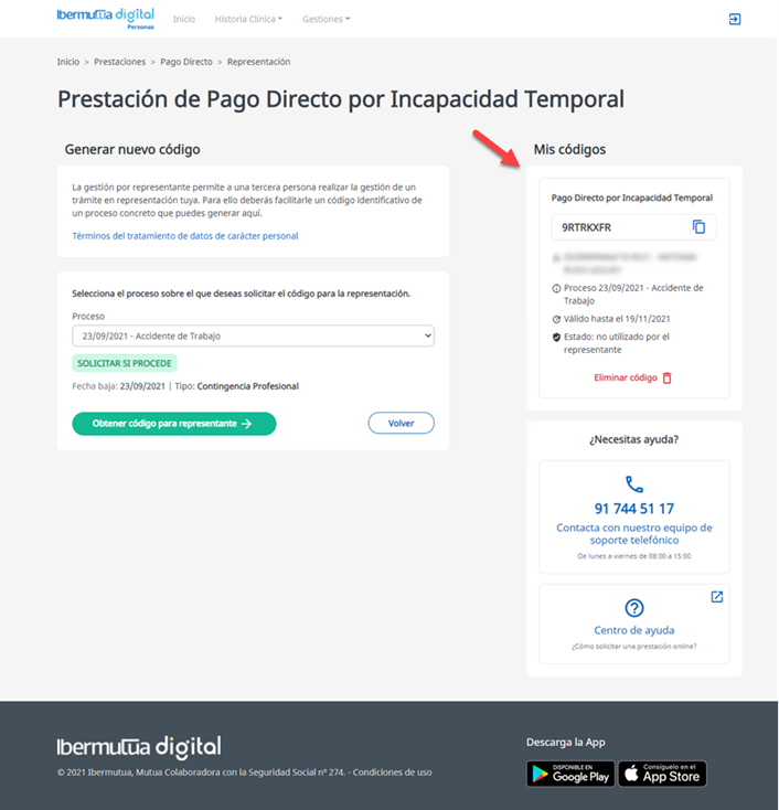 En el caso de optar por la gestión por representación, una vez generado un código de autorización por parte del trabajador desde Ibermutua Digital Personas, se añade una sección informativa en que se recogen los códigos generados, su validez, si ha sido utilizado por parte del representante, así como la posibilidad de eliminar dicho código y la autorización asociada.