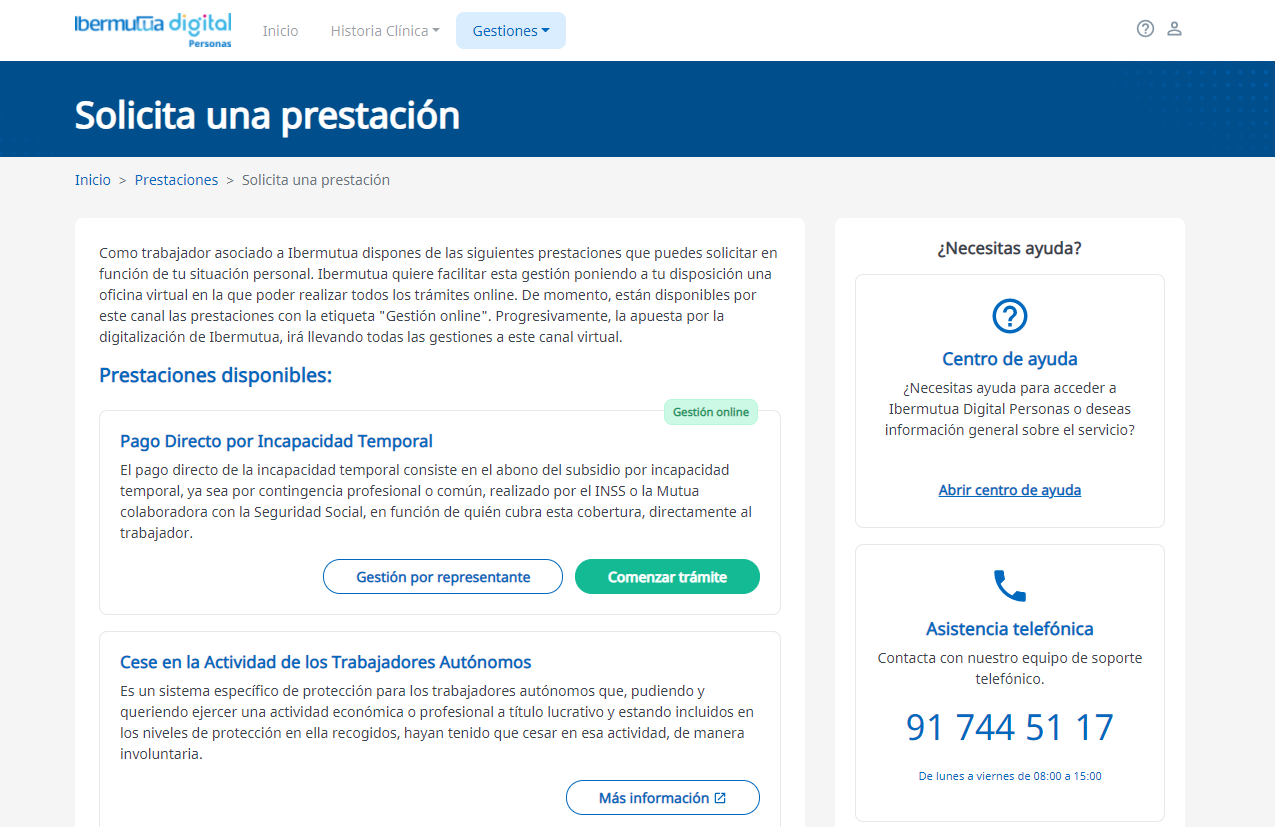- Se incluye la opción de gestión por representante en la pantalla de las prestaciones disponibles