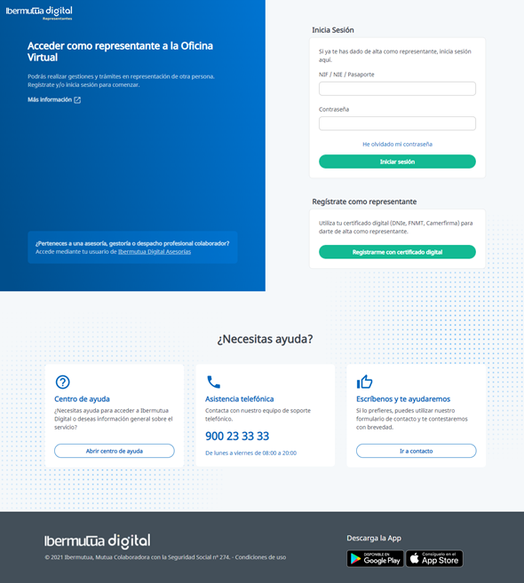 - Nueva pantalla de Ibermutua Digital: Se incluye el acceso por representación dentro del acceso de Personas y se rediseña la pantalla para hacer más visibles los diferentes tipos de acceso y los colectivos a los que van dirigidos.